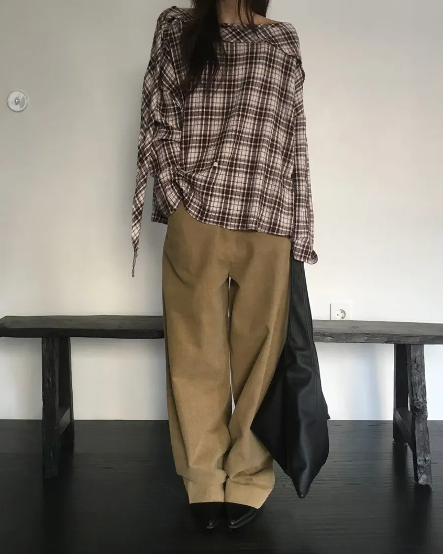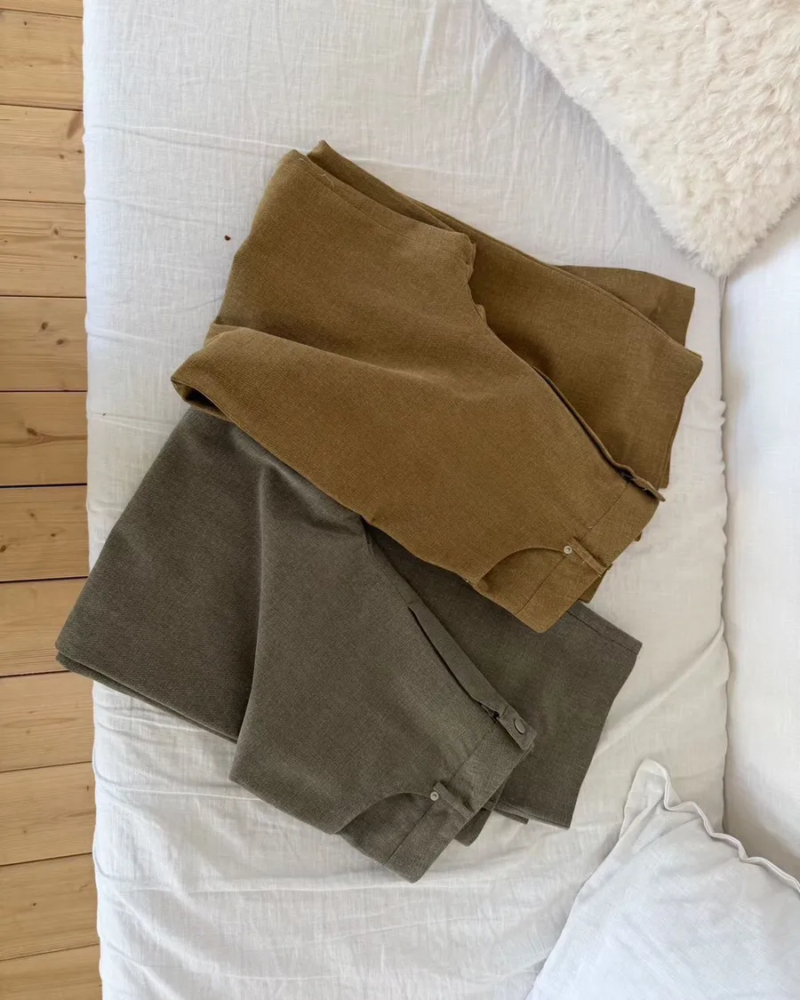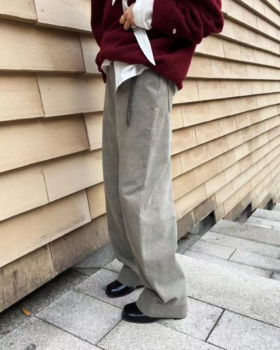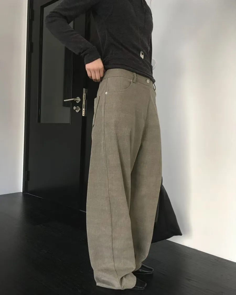 寬鬆的寬褲版型,帶有微弧線條,修飾身形
